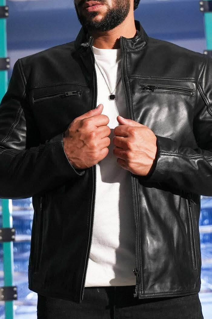 Crafted from premium cow skin leather with a soft polyester lining, this black leather biker jacket combines durability, comfort, and timeless style. Featuring a secure zipper closure, a band collar, simple cuffs, and ample storage with two zippered chest pockets, two zippered side pockets, and two interior pockets, it’s both functional and fashionable. Available in sizes XXS to 4XL, it ensures a perfect fit for all; refer to the size guide for accuracy.